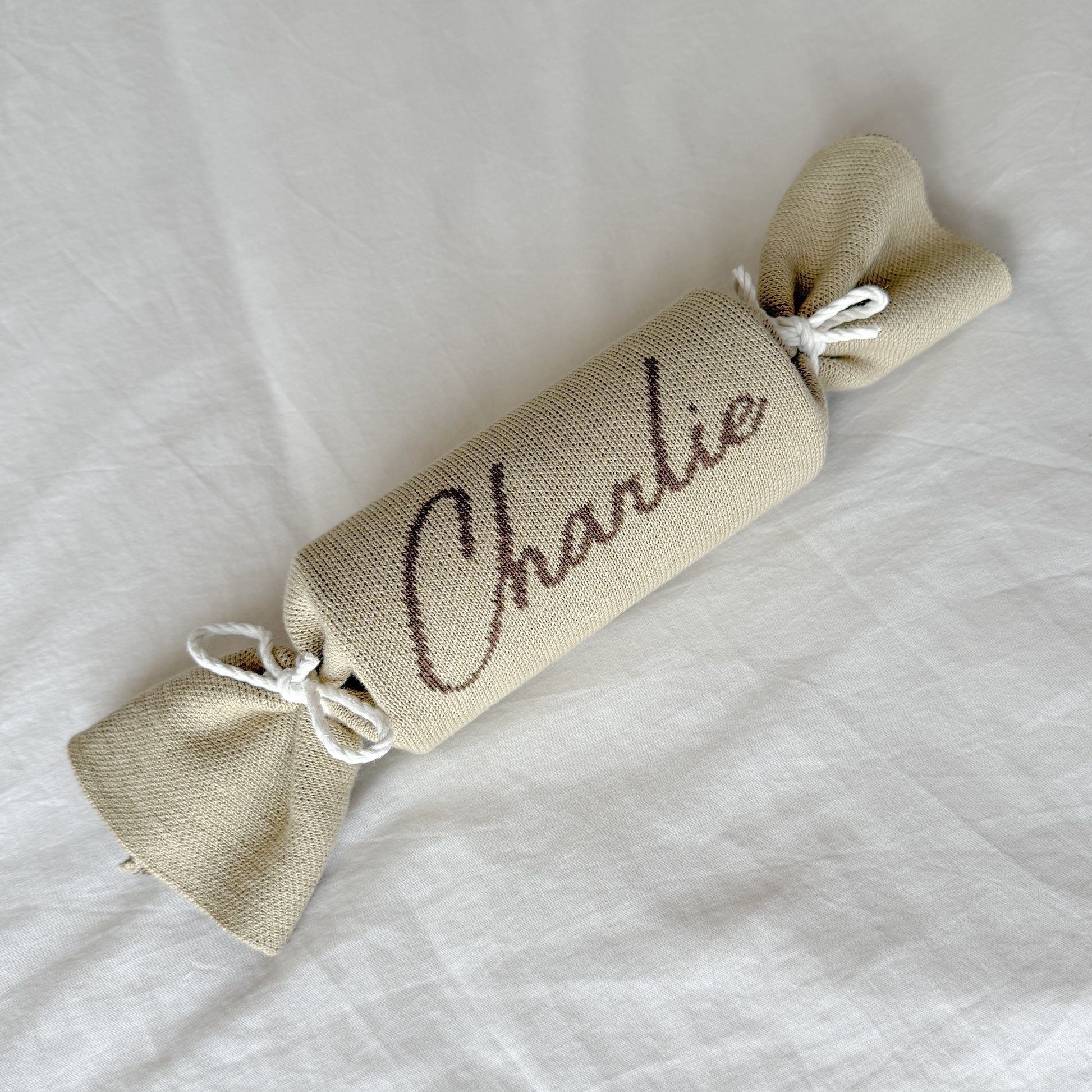 Made from 100% cotton knitted material, each bon bon features your chosen name knitted directly into the design — creating a unique keepsake that’s both personal and reusable.